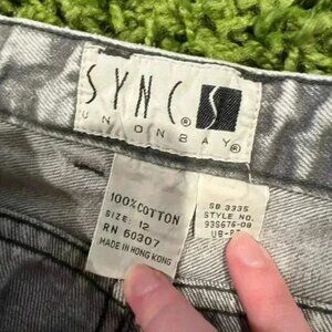 Vintage 80s High Waisted Acid Washed Jeans. Gorgeous stitched details with v design. Gray acid stone washed. Made by Syncs by Unionbay. 100% cotton. Has some small areas of discoloration that are not noticeable - they are in great vintage condition. So cute.