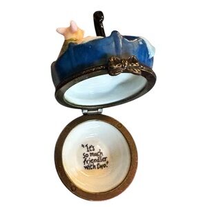 Porcelain hinged box featuring Pooh and Piglet’s “Umbrella Ride”. Excellent used condition. Midwest of Cannon Falls for Disney.