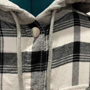 Shirt in woven fabric with a lined, drawstring hood in sweatshirt fabric. Buttons down the front, flap chest pockets, long sleeves with buttoned cuffs, and a rounded hem. Slightly longer at the back.