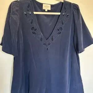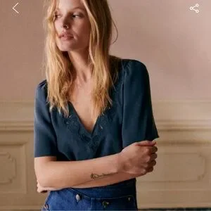 Sezane blouse model navy blue * Silk blouse with ample volume * Short, loose sleeves with gathers at the shoulders * Embroidered neckline