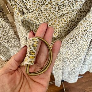 Super cool style w/ a nod to 70s. 100% sanded leather / nubuck in a mustard and black animal print on a beige background—such a fun neutral. I love nubuck; the more you wear it, the softer and more luxurious it gets. Button front, lapels, D-ring belt. Lined w/ cream poly. Kind of in between an overcoat and a car coat—warm but relatively lightweight, perfect for spring and fall. I’ve had this coat forever, but it’s still in beautiful condition w/ no noticeable issues—no stains, spots, tears, etc. It’s never even been broken in, and that’s a shame—it’s too cool to be stuck in a dark closet. Size XL.