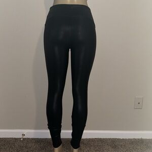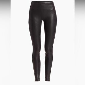 Edgy, faux leather style features a shaping waistband with hidden power mesh for a structured fit