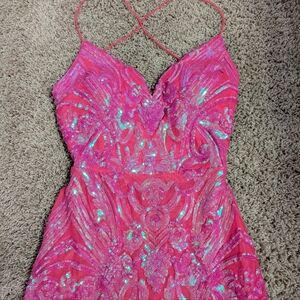 Open back with fixed criss cross straps. Fully lined. All sequins are intact and no rips or tears
