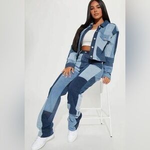 Fashion Nova Hey Girl Patchwork Denim Set Cropped Jacket & Straight Leg Jeans 14 XL Blue