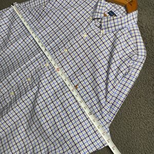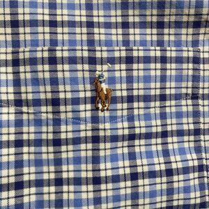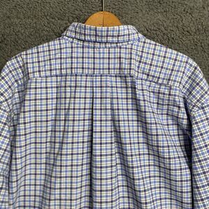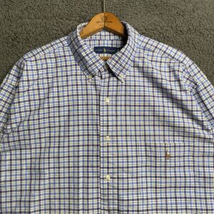 This Polo Ralph Lauren shirt is a men's 2XLT tall size in a classic blue plaid design with a collared neckline and button-up closure. Made of woven cotton fabric, it features a point collar style with the iconic Ralph Lauren Flesh Pony logo on the chest. Ideal for travel, casual outings, or business settings, this shirt is easy to care for and suitable for all seasons. With a regular fit and timeless USA-inspired theme, it embodies a preppy and classic style that is perfect for the modern gentleman.
