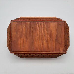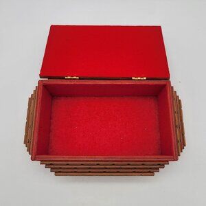 This intricately carved wooden jewelry box features a striking geometric design and a vibrant red velvet-lined interior, offering secure and elegant storage.