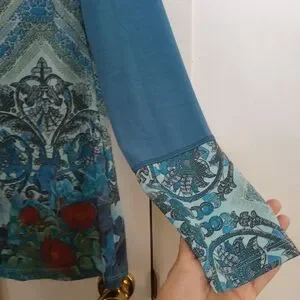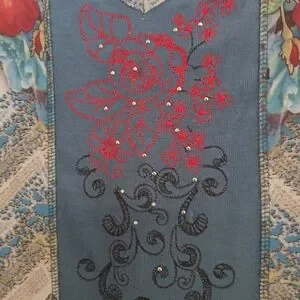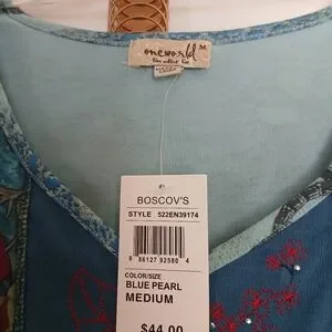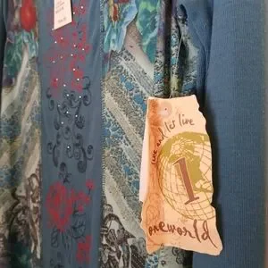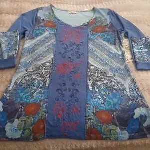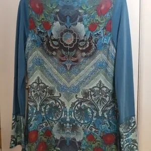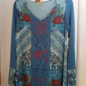 Beautiful One World, long sleeve ,super soft tee tunic top. Embroidered floral front center with silver mini studs. Shades of dusty teal blues,dusty reds, grey and black. Size M. Back center length--28 inches.