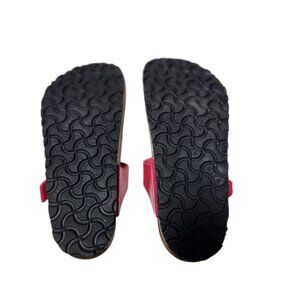 Stylish pink Birkenstock sandals with adjustable straps. Perfect for casual wear.