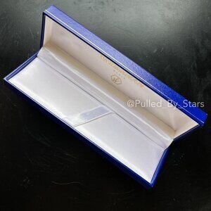 This royal blue hard case features gold lettering on the inside and out. The white satin interior has a satin ribbon placeholder with a bottom that is cushioned for pen place. Exact vintage unknown, but it’s from 2005 at the very latest.