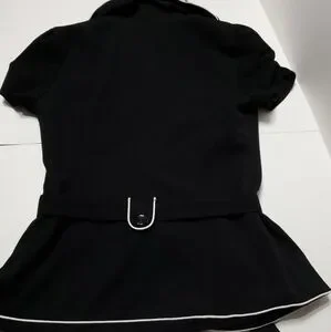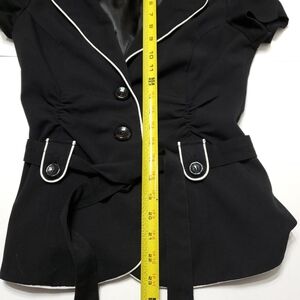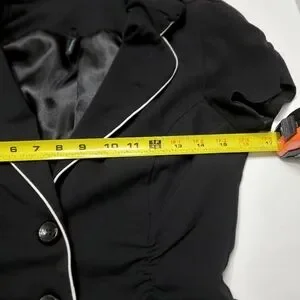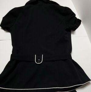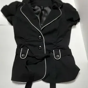 Black button down Vneck blazer with tie around waist. Smoke free home. Not faded. 25 inches long and 16 inches pit to pit. poly/rayon/spandex material. Size Small by Maurices.