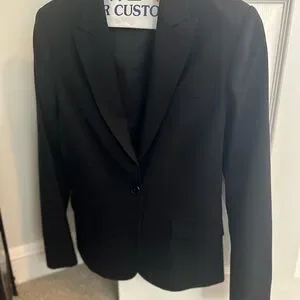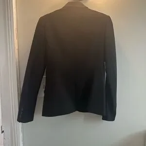 This black blazer from Theory features a tailored fit and classic notched lapels, perfect for professional settings. Its sleek design and smooth fabric make it a versatile choice for any formal occasion.