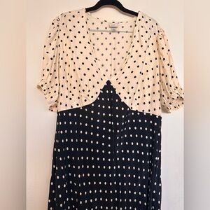 This elegant midi dress features a striking black and white polka dot design, perfect for a wedding guest or cocktail event. The short flutter sleeves and V-neckline add a touch of sophistication, while the midi length offers a timeless silhouette.