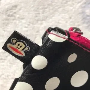 White polka dots on a black background? Yes. An adorable Julius face with a hot pink mouth that matches the zipper? Yup. A rare bird from 2013 in incredible condition? Uh huh. This is a sweet Paul Frank wallet, almost 10 years old. Except for a couple edge scuffs and some wear on the paint of the zipper, wallet is in fantastic condition. Look at that adorable little face on the tiny logo tag! I think this is an unusual one because the monkey’s mouth is hot pink, matching the zipper and the inside fabric. Inside the wallet is spotless. Shell is 100% PVC. Inside fabric is 100% cotton. Note the detail around Julius’s face…how the fabric appears to be raw at edges. Love this one.