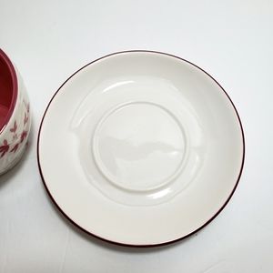 Pre-owned. Great condition. No chips, stains, or cracks. Off white/cream and pink/mauve embossed leaf cup and plate