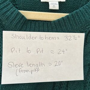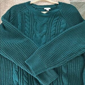 Embrace warmth and style with this J. Jill forest green sweater, featuring a classic crew neck and intricate cable knit design. Its relaxed fit and thick material make it perfect for chilly days, adding a touch of elegance to your winter wardrobe.