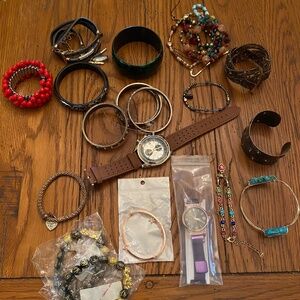 Includes rings, necklaces, bracelets, earrings, Odds and ends. Some are new in their little plastic bags and some are used in good shape and some have seen better days. Nothing expensive. Got it all in a yardsale lot. Some of the rings say 925 but I don't know if they are. Mostly cheaper jewelry.