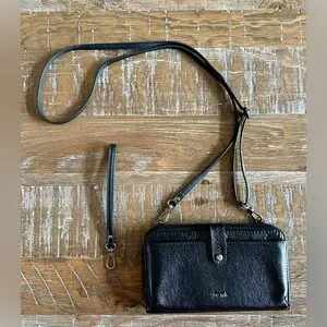 Black leather crossbody bag by The Sak. New, but without tags. Front pocket could hold a cell phone. Strap is adjustable and both straps can be removed. Could double as a wallet.