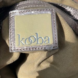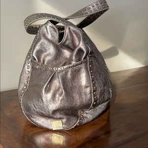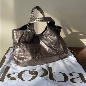 Beautiful metallic silver shoulder satchal bag by Kooba- small studded rivets lining the outside of the bag. side of purse has brass metal tag that reads KOOBA. Two outside side pockets with magnet snaps - great to quickly place your telephone or keys in. Beige heavy cotton lining with large pockets to organize your items in! super practical bag, wonderful size! in wonderful condition, barely used.