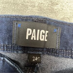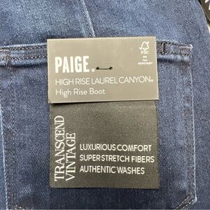 These are Paige Laurel Canyon bootcut jeans in size 24, featuring a raw hem and a dark blue color. The jeans have a high rise and are made of a cotton blend fabric. They come with a zip and button closure, with a 32-inch inseam. The brand is Paige, and the style is bootcut. The jeans are designed for women and were manufactured in Mexico.