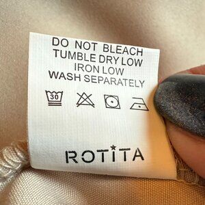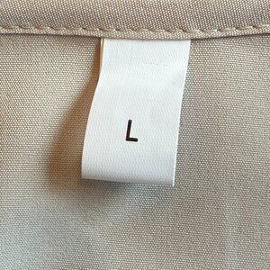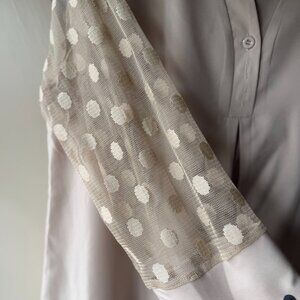 Lightweight 3/4 Length Sleeve Blouse with Mesh Polka Dot Sleeves in Beige. Button V-Neckline. Designer: Rotita. Size: Large. NWOT.