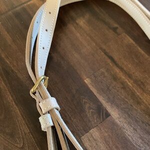 Abby Alley sling bag in Gardenia (light beige w/hint of pink). Excellent condition; one mark on back & faint scuff at left top on back (see photos). Sustainably sourced Kenyan cow leather, cotton lining, brass finishes. Length across top 20”, height from center 6.5”. Adjustable strap.