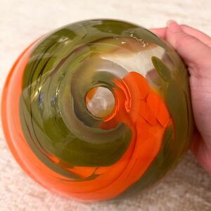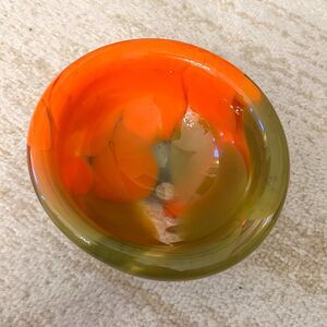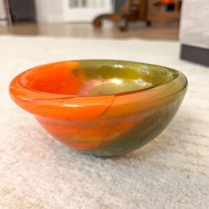 Vintage 6in Blown Art Glass Bowl Orange Green Swirl Rounded Edges Handmade