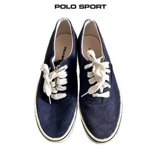POLO SPORT Men's Dark Blue Suede Lace Up Sneakers Size 8 Low Top Tennis Shoes. Elevate your footwear collection with the sleek Polo Sport Men's Dark Blue Suede Sneakers. These low top tennis shoes offer a polished look with their solid dark blue color and premium suede upper material. The lace-up closure ensures a secure and customizable fit, perfect for an active lifestyle or casual outings.