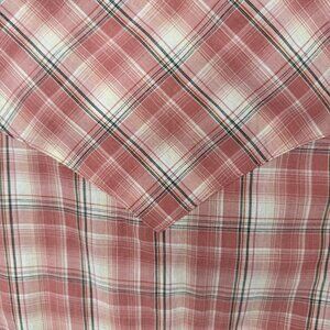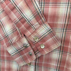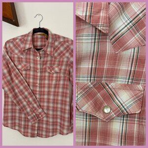 Quintessential Western wear, this Wranglers plaid, collared, button down with snap pearl buttons at every closure brings you front and center on trend.