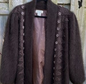 This vintage angora duster cardigan features luxurious rabbit hair angora, a soft draped silhouette, and delicate beaded floral detailing along the front panels. The texture is rich, airy, and unmistakably vintage — the kind of piece that elevates even the simplest black dress or silk slip.