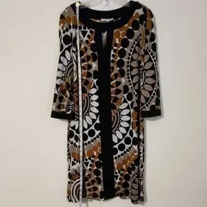 Pre-owned in excellent condition. Sandra Darren stretch multi colored 3/4 sleeves shift dress keyhole neckline size 12. See more photos for measurements, fabric contents, and care for instructions. Smoke-free home.