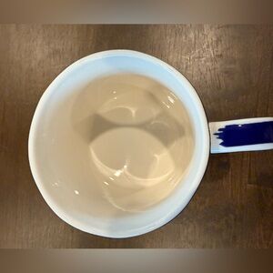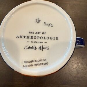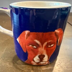Ceramic mug featuring “Duke” the dog illustration. by Carole Akins. Vibrant blue with a brown and white dog design.