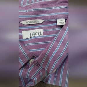 Elevate your wardrobe with this stylish Nordstrom button-up shirt in a delightful lavender white striped pattern. The shirt comes in Men's Size XL, featuring long sleeves and a collared neckline with a button-down style. The shirt is made of comfortable cotton material and is perfect for any occasion, be it a travel adventure, party, business meeting, or casual day out.