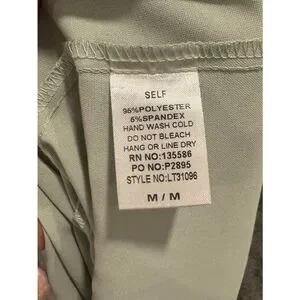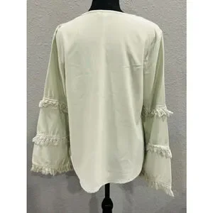 This is a women's long-sleeve blouse by Main Strip. It is a size M and is made of 95% polyester and 5% spandex. The blouse is a light green color and has a V-neck with a tie at the front. The sleeves are long and have a tiered fringe detail. The blouse is in good condition with no visible imperfections. It is approximately 24 inches long and 18 inches wide. The blouse is designed to be worn casually and is suitable for a variety of occasions.