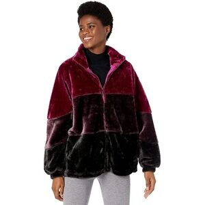 A stand-collar silhouette that contrasts three bold colors, this zip-up jacket is made from the coziest faux fur, offering the perfect fit with elasticized cuffs and a bungee-adjusted hem. Lined in soft cotton, it features convenient side pockets.