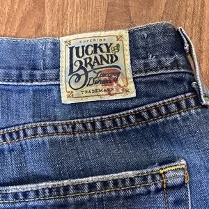 These blue flare classic leg jeans from Lucky Brand feature a playful embroidered floral design on the lower leg, adding a unique touch to the classic denim style. The medium wash gives them a lived-in look with subtle fading, perfect for casual outings.
