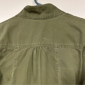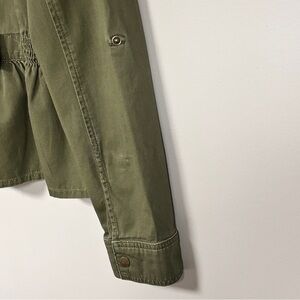 Elastic gathered waist, four cute little pockets, and gold tone snaps make a super cute jacket. Measurements are 18 inches; pit to pit, buttoned, and 22 inches in length. Size XL / 16