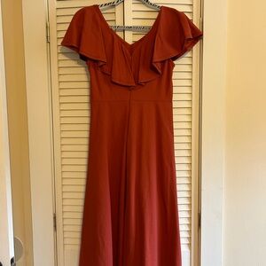 This is a burnt orange (I believe) dress with an elegant top. I wore this dress to a wedding and was comfortable for the night.
