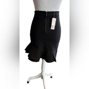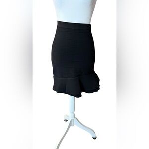 This chic Bebe Jet black bandage mini skirt features a stylish ruffle, perfect for any occasion. Its sleek design adds a touch of elegance to your wardrobe.