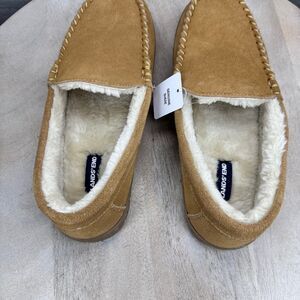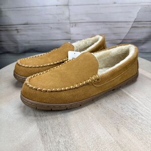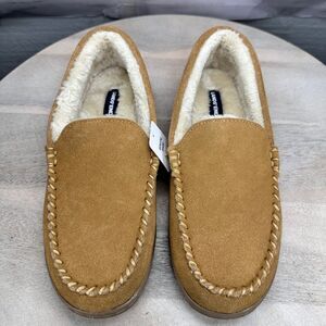 Lands' End Mens Slippers Size 9 Fuzzy Lined English Tan Suede Moccasin Slipper