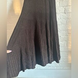 This v-neck sweater dress is knitted from our Sculpted high-stretch yarn--one we love for its contouring effect that lays smoothly against the skin. Here, we employ it in a sunburst pattern of ribbed stitches that drape into elegant folds, revealing flashes of metallic panels at the hem.