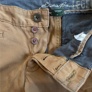 Eddie Bauer tan pants with a classic design. Button front closure. Relaxed fit. Stylish accent on outer seam. Perfect for casual wear, super comfortable! Gently used condition.