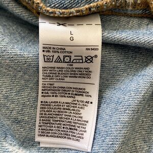 Stylish light blue denim jacket with distressed details. Features button closures and front pockets. Used very good. Looks a little worn but no visible issues. Size large.