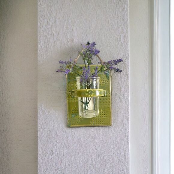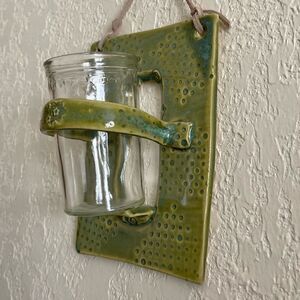 Handcrafted Pottery Glazed Green Wall Sconce with Vintage Star Rim Jelly Jar