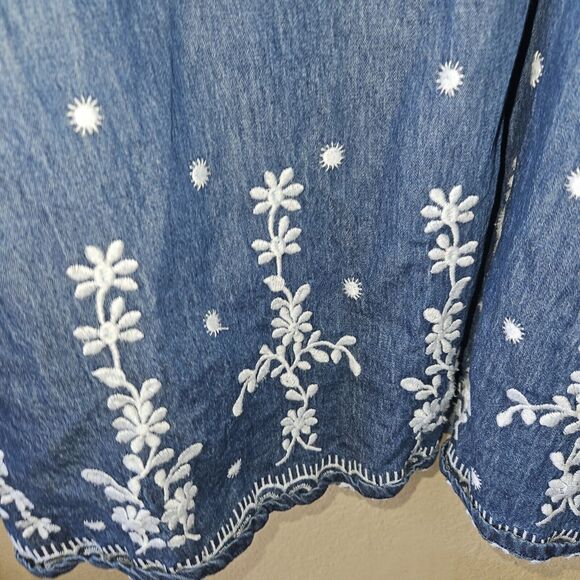 Country Store Denim Dress Large Blue Embroidered Floral Pintucked Knee Length L