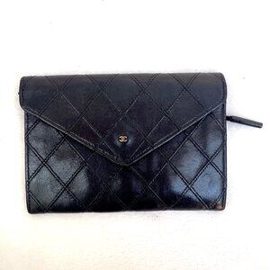 Authentic This small Chanel is a great first foray into luxury! It has a snap that works well and 2 slip pockets for your cards or cash. The back has a zipper pocket for coins or other small items. approx measurements: 5"X4. "The leather shows minor signs of use and wear. It is in very good condition, very clean, no odor, except where the serial code sticker should be is a hole as if someone had ripped it out (see photos). Otherwise, this wallet is ready to carry your cash!