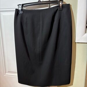 This pretty black skirt has a full length gold zipper on the left side and a 12” ruffled attached to the top of the zipper. Fabric is 92% polyester and 8” elastane giving it plenty of stretch. Skirt is in new-like condition and has just been dry cleaned. Measurements are length 21” and waistband is 30”. Pet and smoke free home. Excuse the shade of pictures, black in the skirt is much brighter.