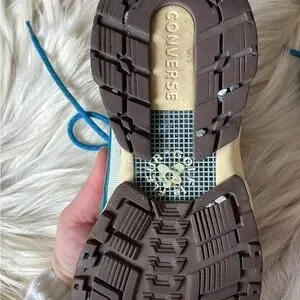 Stylish teal and cream sneakers with unique design. Perfect for casual wear.