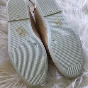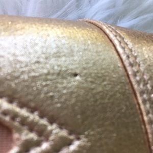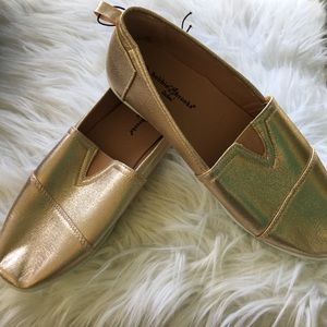 Adorable metallic gold with hint of rose slip on shoes with slit on upper. One small flaw on the size 6 one little dot on the top I think my cat might’ve bit the shopping bag and his tooth went thru nade one dent not a hole Shown in the pic size 6