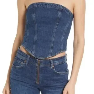 Craft from stretch-kissed organic cotton, this denim top is strapless for a bustier-inspired look. 14" length (size 8) Strapless Lined 98% organic cotton, 2% elastane Machine wash, tumble dry