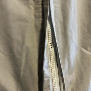 Item has some marks on front and cuffs, color can appear like a very light silver white in some lighting. The zipper is missing 3 teeth toward bottom, however it zips with no issues.